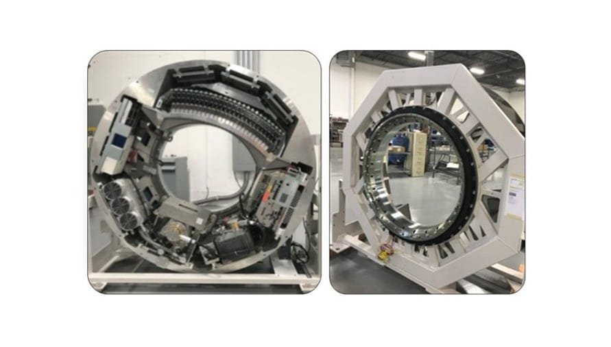 El gantry DivineArk utiliza un soporte de suspensión magnética (Maglev) y un motor de accionamiento directo para alcanzar una velocidad de rotación de 0,25 segundos. El Maglev proporciona un funcionamiento sin contacto entre el rotor y el estator, lo que resulta en una mayor aceleración para alcanzar la velocidad especificada rápidamente en el modo silencioso (20dB menos que el normal). El uso de un motor de accionamiento directo también reduce eficazmente los artefactos, lo que resulta en una imagen más estable y precisa.