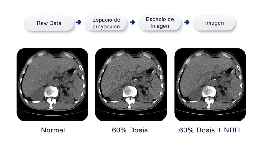 El algoritmo de iteración NanoDose (NDI) es una innovadora técnica iterativa para la reconstrucción de imágenes que aprovecha al máximo el aprendizaje profundo de la estructura anatómica en el espacio de la imagen, así como la iteración basada en el modelo que implica el tubo y detector en el espacio de proyección, con el objetivo de generar imágenes nítidas en alta resolución con la menor dosis posible.